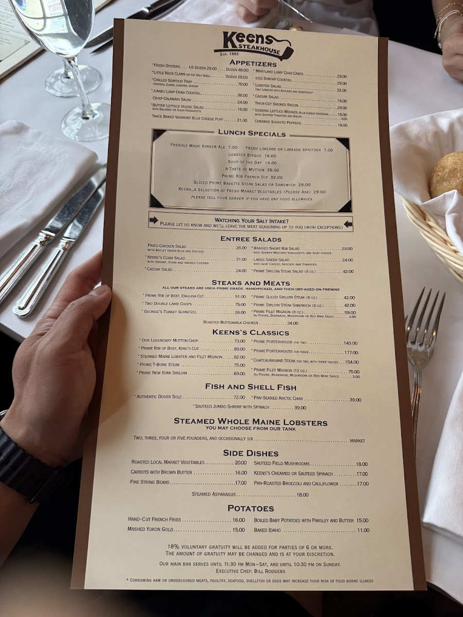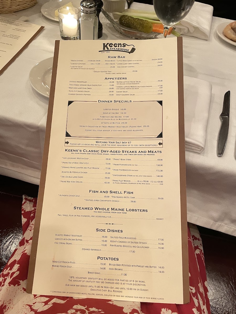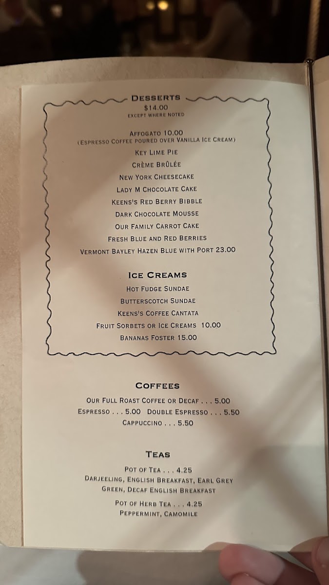 The ambiance is lively yet intimate, perfect for both couples and large gatherings. Guests have raved about the exceptional service delivered by the attentive staff, whether it’s a birthday celebration or a quiet dinner. Pam Killoran noted the warm welcome and accommodating service that added a special touch to her family’s celebration, demonstrating Keens' commitment to creating memorable dining experiences for all guests.